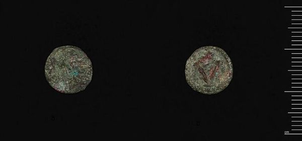 Curator: Here we have an Antoninianus of Tetricus I, described as a "barbarous imitation," currently residing in the Harvard Art Museums. Editor: The overwhelming sense is of decay, that verdigris green hinting at a story almost erased, a memory clinging to existence. Curator: Indeed. The term "barbarous imitation" speaks volumes about Roman perceptions of cultures beyond their immediate control. It's a loaded term that highlights Roman anxieties about their own power and the perceived threat of external influences. Editor: But isn't there a raw, rudimentary quality in its execution? The very crudeness of the lines gives it an undeniable power. Curator: Absolutely. It shows how cultural symbols and power can be re-appropriated and reinterpreted, even by those deemed "barbarous." It raises interesting questions about authenticity and cultural exchange. Editor: A fascinating microcosm of power dynamics, captured in a tiny, corroded coin. Curator: It is truly amazing how much one coin can tell us about shifting borders, cultural anxieties, and the fluidity of artistic expression.