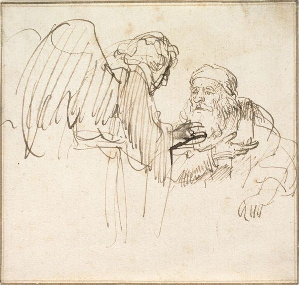 Editor: Here we have Govert Flinck’s pen and brown ink drawing, "Gideon and the Angel." It's a small work, and the rapid lines give it a sense of immediacy. What can you tell me about this piece? Curator: Look at the paper itself, its weave and preparation. The speed of the lines suggests a study. Was this a preparatory sketch? How was the ink manufactured, and what does its specific hue suggest about trade routes and availability of materials? Flinck’s labor here is evident. Editor: So, it's less about the religious narrative and more about the physical act of creating it? Curator: Precisely. The materials and their deployment reflect the social and economic conditions of artistic production in Flinck’s time. What does its existence say about patronage and artistic training? Editor: That's a completely different way of seeing it. Thanks! Curator: Considering these elements certainly changes our understanding.