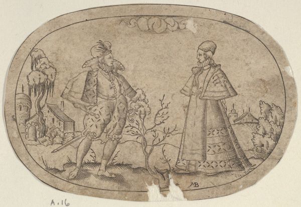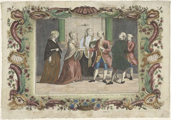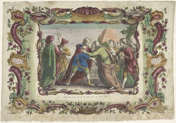 Curator: Before us, we have an 18th-century print by Giovanni Volpato, titled "De verloren zoon neemt afscheid van zijn vader"—"The prodigal son says farewell to his father." It’s currently held here at the Rijksmuseum. Editor: What strikes me first is the hand-painted quality to the print, giving it a freshness that seems at odds with the supposed seriousness of the subject matter. The floral border, like ornate chintz, softens what could be a moment of intense paternal conflict. Curator: Indeed. Volpato's choice to employ etching techniques for wider dissemination makes this parable accessible beyond elite circles. This image serves not just as a visual delight but also as moral instruction in domestic settings. Its medium reveals its socio-cultural role as a tool for instilling values. Editor: I'm drawn to the landscape details – a backdrop indicating class privilege through well-tended grounds. Observe how the fabrics delineate social rank; the father’s luxurious robes and the son’s tailored suit showcase wealth via tangible materials. The labor invested in cultivating status shines through. Curator: Absolutely, and considering Volpato's background as a celebrated engraver who reproduced frescoes, prints such as this catered to a growing demand for accessible art among the middle class. These biblical narratives reinforced social hierarchies, reflecting an established moral framework that promoted social stability. Editor: Yes, while that floral border almost reads as frivolous, it might actually indicate its consumption by middle-class households. Was this framed and displayed within a domestic space, reflecting aspiration via its decorative and material properties? This suggests that it's functioning on several socio-economic registers, not merely as religious iconography. Curator: A keen observation; seeing it as an active cultural agent reveals its purpose far exceeds straightforward visual engagement. Its accessibility made art a talking point—and this print prompted conversations around virtue and proper behavior in burgeoning capitalist societies. Editor: Seeing how the work blends visual narrative with moral teachings alongside domestic aesthetics, I perceive echoes of both personal reflection and societal aspirations of the eighteenth century reflected in each carefully etched and colored line. Curator: A thought-provoking summation, providing vital insight into the cultural ecosystem supporting its emergence. Editor: Quite. An exploration that sheds light on not only the visual presentation of "The Prodigal Son" but also on how material accessibility helped influence social narratives.