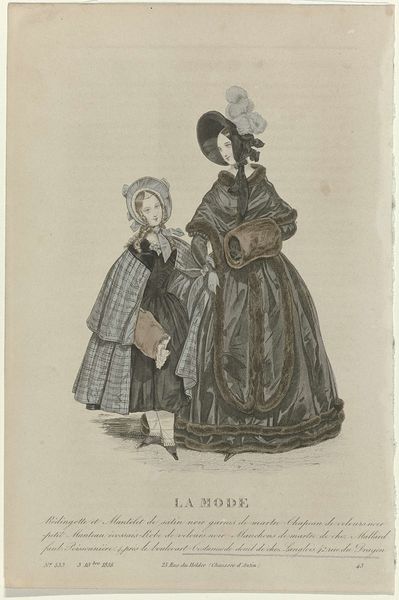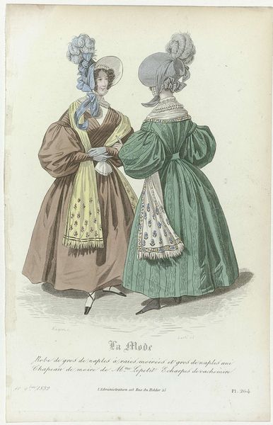 Jean-Denis Nargeot created this print, "La Mode," in July 1833. It captures fashion in a moment of significant social change. The print depicts two women adorned in the height of early 19th-century fashion. Yet, beyond the lace and bonnets, it reflects the complex negotiations of gender and class of the period. Fashionable women were both objects of admiration and subjects of scrutiny, their clothing a signifier of status, but also a marker of their limited roles in society. What does it mean to be both adorned and confined? Notice how details like the delicate embroidery and elaborate hats speak to a culture of refinement and luxury. How does this emphasis on appearance intersect with our understanding of women's roles and identities in 1830s France? Ultimately, "La Mode" presents an idealized image of femininity and invites us to consider the social and personal implications of such representations.