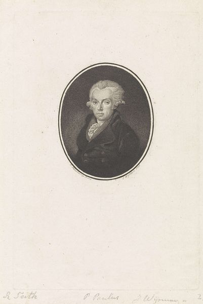 This is Jacob Ernst Marcus's portrait of Johann Jakob, made using etching. The oval composition immediately draws the eye, the figure is neatly contained, giving a sense of classical order. The monochromatic palette allows us to appreciate the intricate textures achieved through etching. Marcus uses a network of fine lines to define form and create tonal variation. Notice how the density of these lines changes to suggest the fall of light, particularly around the face and clothing. This evokes the sitter's character, a contemplative intellectual. The artwork challenges fixed meanings through its simplicity, inviting multiple interpretations. This portrait operates within a broader cultural discourse about representation, identity, and the individual. Its interpretation is ongoing.