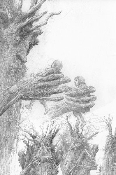 Here, Alan Lee captures Treebeard, the ancient shepherd of the forest, in watercolor. The dominant image is that of the wise, old tree, whose deep-set eyes reflect both immense age and deep understanding. He is the guardian of the forest. We can trace the image of the wise, old tree back through time. Think of the Tree of Knowledge in Eden, or the World Tree Yggdrasil in Norse mythology. These ancient symbols reflect a collective human understanding of the wisdom and knowledge found in nature. The Ent's form, a blend of human and arboreal, elicits our primordial connection to nature. This collective memory of the forest as a place of mystery and knowledge is a powerful force, engaging us on a subconscious level. The Treebeard reminds us that the wisdom of the natural world is deep-rooted in human consciousness. The forest has always been a place of deep-seated human fears, but also a sanctuary. Treebeard is more than a character, he is a symbol of humanity's timeless relationship with nature.