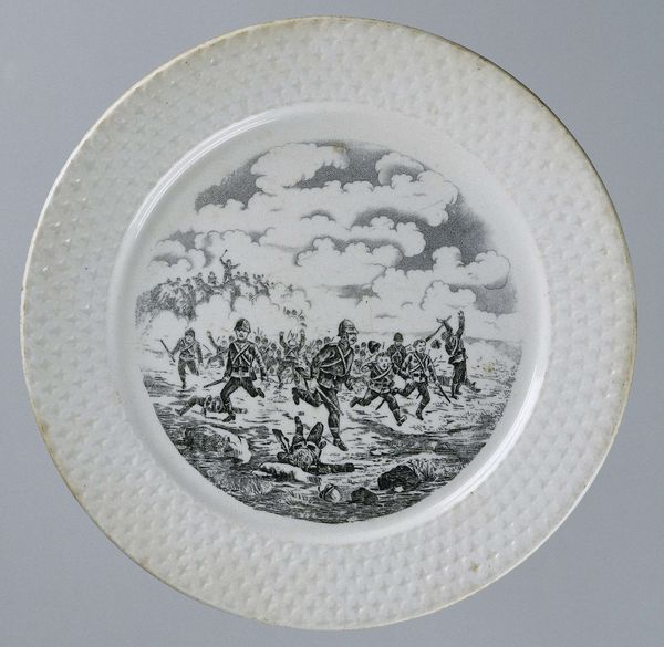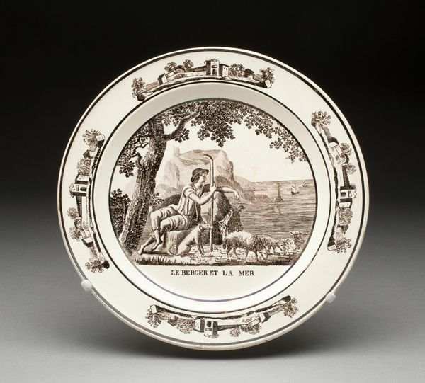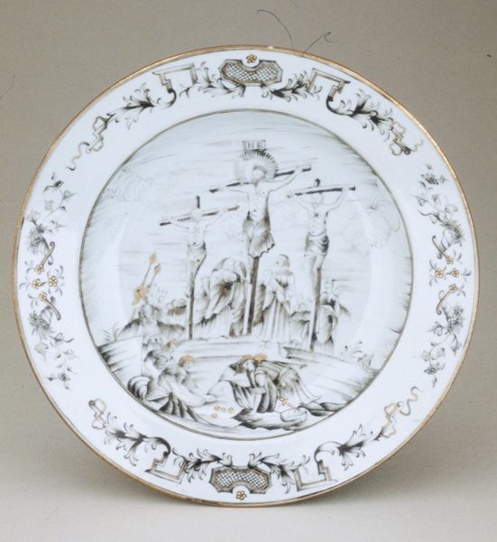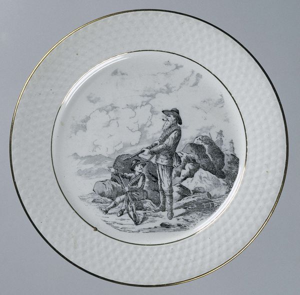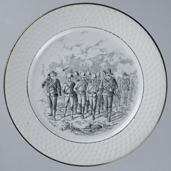 This is a dish with a portrait of Jan van Leyden made by an anonymous artist. The design on the plate is structured within a circular frame, typical of dishware, but this form is subverted by the ornate, swirling embellishments along the rim, creating a visual tension between utility and artistic expression. Inside, the monochromatic palette emphasizes the figures and their arrangement. The artist uses line and form to convey power and status. Jan van Leyden is portrayed on horseback, positioned centrally, his figure larger and more imposing than those around him. This hierarchy is further emphasized by the inscription below, anchoring him as the focal point. The two men attending to him add balance and depth, but also reinforce the central figure's dominance. This dish functions beyond its practical use, it serves as a potent symbol of authority, crafted from the very structure and composition of its design. It invites us to consider how power is visually constructed and consumed.