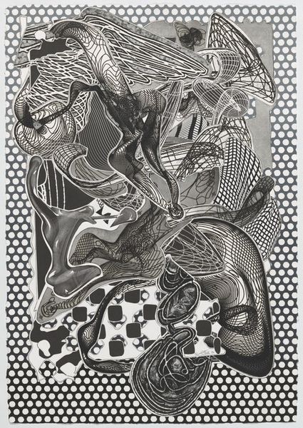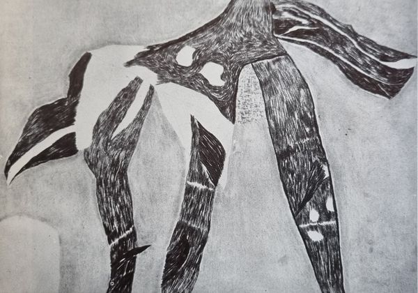 Vajda Lajos made this print, Kopony Madárral, in 1939. It’s a monochrome image, all greys and blacks, that reminds us that artmaking is a process of layering and revealing. Look at the upper part of the piece: the head is created with a kind of net or web, almost like a matrix. The lines are dense, yet they don't quite obscure the light shining through. It’s a balancing act between presence and absence. The texture is rough, the marks are raw, and you can almost feel the artist's hand at work. It's like a visual poem, open to interpretation. The lower part is equally compelling, with sharp, angular shapes. They echo the head and draw you back into the work. Does Lajos remind us of Klee, in the way that he creates a world of symbols and signs? In the end, it’s up to us to decide. The beauty of art lies in its ambiguity.