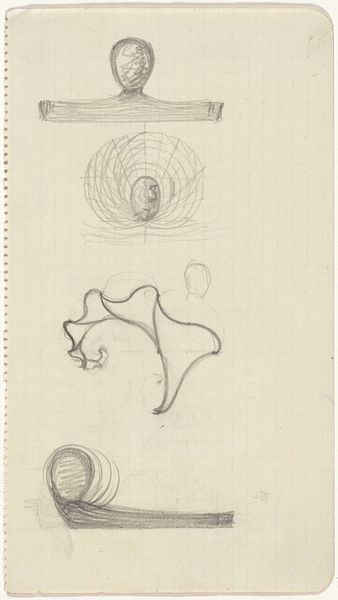 Editor: This sketch, "Ontwerp voor een miskelk," attributed to Mathieu Lauweriks and created sometime between 1874 and 1932, is a pencil drawing on paper. I find the linework fascinating – it's so delicate, yet the form of the chalice is clearly communicated. What do you make of its composition? Curator: The work invites analysis on several levels. Observe first the overt geometric scaffolding, particularly in the upper register, versus the organic and free flowing draftsmanship of the chalice. Editor: Yes, the geometry above is so rigid compared to the cup below. Why is there this geometric structure? Curator: Lauweriks employs geometric form not simply for structure but also for meaning. Here it operates as a structuring principle against the free flowing. It allows us to recognize a proportional relationship to an ideal type, while the chalice offers a freer visual expression. Do you notice the varying densities in line and the significance? Editor: I see that the lines are darker and more dense at the base than those higher up on the cup. Does that imply a feeling of heaviness? Curator: Exactly. By concentrating the lines, Lauweriks draws our eyes to the weight and anchor of this liturgical piece. It contrasts with the chalice, which by nature is light and transparent, holding sacramental liquid. In the totality of its parts, the chalice can be seen to resolve into a synthesis. Editor: It’s so interesting how even a sketch can communicate such complex ideas through line and form! Thanks for the new insights! Curator: Indeed. Nuance of form becomes powerful semiotic indicator. I, too, am grateful for the insightful exchange.