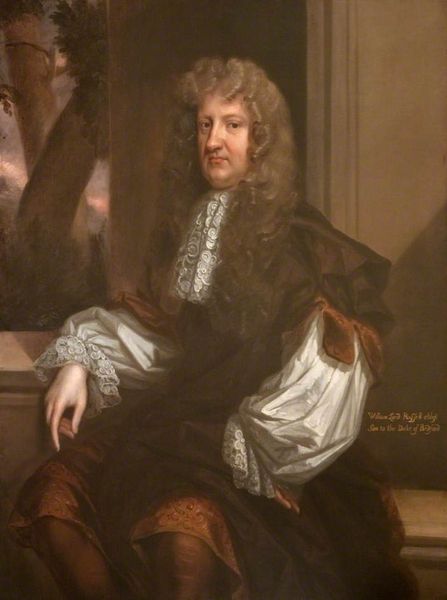 John Riley painted this portrait of William Chiffinch, a prominent figure in the court of Charles II, using oil on canvas. The flowing wig, a symbol of status and authority, immediately catches the eye, connecting us to the theatricality of Baroque court life. Consider how this elaborate hairstyle echoes earlier depictions of royalty and nobility across Europe. It is reminiscent of classical sculptures of rulers, where hairstyles and garments are used to convey power and divinity. This recurring motif underscores a timeless human desire to embody authority through visual cues. The wig, however, has evolved. While it once signified virility and power, here it also suggests vanity and the fleeting nature of worldly status. Note the psychological weight of Chiffinch's gaze: a blend of confidence and perhaps a hint of melancholy. This potent combination engages us on a subconscious level, stirring our own reflections on mortality and the ephemeral nature of power. The cyclical progression of such symbols reminds us that even the most potent images are destined to resurface and evolve, taking on new meanings in the ever-turning wheel of history.