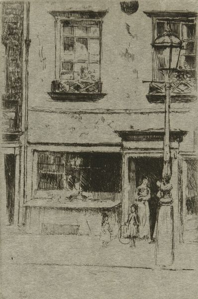 Frederik Hendrik Weissenbruch created this print, "View of old houses in Leiden," using etching techniques. Weissenbruch, who lived from 1828 to 1887, situated himself within the Hague School, a group of Dutch artists who embraced realism. This piece invites us to consider the lives of the women depicted. Are they residents or merely passersby? The woman in the doorway seems to look out onto her community, while the other, burdened with a heavy jug, seems to be performing more laborious work. Note the architecture. The wear and tear on the buildings suggests the passage of time and the endurance of daily life. The scene could be interpreted as a commentary on the social fabric of 19th-century Dutch society, with its emphasis on domesticity and the roles of women within it. Weissenbruch’s choice to focus on this subject matter invites reflection on the everyday experiences that constitute history.