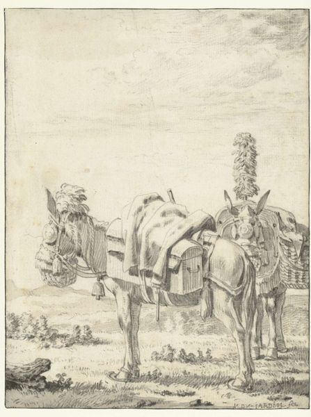 This is an anonymous line engraving of two pack donkeys in a landscape, held at the Rijksmuseum. Notice how the composition is structured around a stark contrast between the detailed foreground and the open, almost vacant sky. The donkeys, meticulously rendered with fine lines to show their heavy loads and textured coats, occupy the lower half. This weighting creates a sense of groundedness, of labor, while the expansive sky above suggests a space of freedom. The artist uses line not just to depict but to construct meaning. The careful delineation of the donkeys contrasts sharply with the sketchier, more atmospheric treatment of the background. This contrast may reflect a cultural code, highlighting the tangible realities of work against the backdrop of an idealized nature. It asks us to consider how these elements interact, challenging any fixed interpretation and instead inviting ongoing reflection on labor, landscape, and representation.