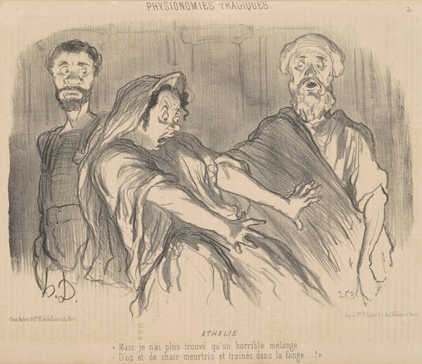 This lithograph, "Bérénice Must Choose Between Titus and Antiochus", was created by Honoré Daumier, a French printmaker, in the 19th century. Daumier's work exists within a historical context marked by significant political upheaval, including the 1848 Revolution and the rise of the bourgeoisie. His artistic lens captured the essence of French society, often focusing on the experiences of the working class and the social disparities of his time. In this print, Daumier uses an intersectional lens to present a drama of choice and consequence. The central figure, Bérénice, is torn between two men. This scenario, drawn from classical literature, invites us to consider themes of love, duty, and power. How does one reconcile personal desires with societal expectations? The emotional tension is palpable, reflecting the universal struggle to define one's identity amidst conflicting demands.
