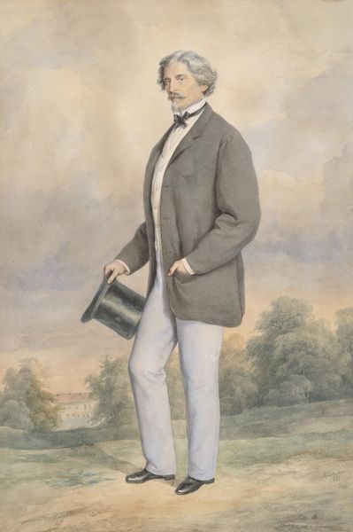 Curator: Oh, look at this; a very dignified figure. Shall we dive into Thomas Lawrence's "Portrait of David Lyon"? I find this painting striking; Lyon is so perfectly poised amidst what feels like his own domain. Editor: Domain indeed! I’m immediately drawn to the air of restrained confidence. He practically radiates subtle authority, doesn't he? Almost theatrical. That coat and backdrop have echoes of power and control. Curator: Absolutely, the fur-lined coat almost cocoons him, it gives a kind of visual anchor that plays well against the muted yet sprawling landscape. The light catches him perfectly, and for me, emphasizes an elegance of mind. He holds himself so upright! Do you feel that too? Editor: I do, but that posture! It feels consciously assumed, as if every line, every angle, is meant to project a carefully constructed image of status. Is it genuine, or a pose? That is what’s intriguing. The landscape mirrors it – it’s grand, but subdued, a backdrop designed to amplify rather than distract. Curator: But think about Romanticism and the tradition of portraiture! Isn’t this theatrical staging somewhat of an insight to Lyon’s interior state? Or a commentary on society itself? The slightly blurred edges and somber coloring are also romantic era tells. Lawrence uses shadow here like a painter uses rhythm, it seems! Editor: Maybe. To me, it's the control that stands out – that cane, that composed expression – but does that mask any vulnerability? I always look at the objects in paintings, here the cane for instance is not just an accessory but an emblem, an external sign of internal stature, power. A power constructed to persuade and endure! Curator: That's such an insightful observation, especially thinking about the subtle narratives that are weaved into such formal portraiture. We get a snapshot of cultural values and individual performance, even, here. It has given me an avenue into seeing this canvas afresh, what about you? Editor: Absolutely. Exploring how images accumulate symbolic power over time reminds us how deeply entwined we are with our culture's visual language. The psychological and emotional weight of these symbols never gets old!