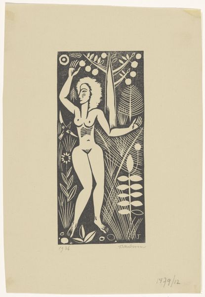 Curator: Eric Gill's wood engraving, "New England Woods," presents a female nude amidst abstracted trees. It's tiny, only about 9 by 6 centimeters. What's your immediate reaction? Editor: Stark. The starkness of the black ink against the light paper certainly accentuates the composition's bold lines and the figure’s geometric form. Curator: It feels both classical and modern, doesn't it? The figure is reminiscent of a Greek goddess, but the stylized trees are pure Art Deco. Editor: Indeed, the flattened perspective and the rhythmic repetition of the tree patterns reveal Gill's engagement with modernist aesthetics. Note the almost calligraphic quality in the rendering of the woman's form. Curator: The New England woods become a space for a sort of primal awakening. It's all so reduced, so elemental. Editor: Perhaps the small scale invites an intimate contemplation. It's a gem, really. Curator: Precisely.
