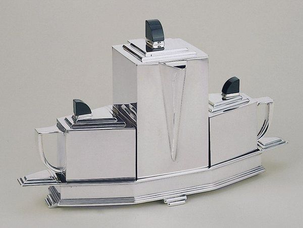 Curator: Editor: Here we have Jean Theobald's "Creamer from a Tea Service," created in 1928. Made of metal, it really embodies the Art Deco style. I’m struck by the sharp geometric forms. What do you make of it? Curator: Immediately, the repetitive forms tell a story of mass production techniques. It’s American decorative art, but think about what "American" means in the 1920s. It signifies an industrial powerhouse striving to break from European tradition. Editor: So you see the materials and manufacturing as essential to understanding its artistic value? It isn't necessarily about craft as much as it’s about how things are made accessible through manufacturing processes? Curator: Exactly! We see the value shifting from the hand-crafted object to the machine-made one. Think of the social implications – who could afford this, how would its consumption impact the working class creating such pieces? This cream jug isn't just a pretty object, it represents the socio-economic structure of its time. Do you see any influence of architectural design, maybe of skyscrapers, since it was created in 1928? Editor: Yes! The stepped details remind me of buildings. It feels like a miniature modernist city, a skyscraper scaled down to fit on a tea table. Do you see the mass production influencing decorative choices, moving towards simplification? Curator: Without a doubt. Decoration becomes streamlined, adapted for efficiency. No longer the heavily ornamented styles of previous eras, here materials like chrome and new synthetics become hallmarks of a machine age aesthetic, affecting labor, materials and class distinctions. It seems simple, but its manufacturing reflects the huge socio-economic shifts that shaped that era. Editor: I never considered a cream pitcher as a document of material culture, thank you for enriching my view. Curator: It goes to show that everyday objects can be historical texts if you know how to read them!