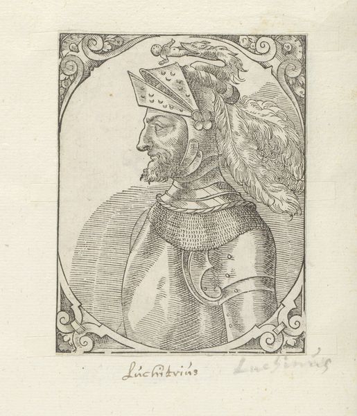 Editor: We're looking at an engraving from somewhere between 1549 and 1575, titled "Portret van Farinata degli Uberti." It's an old engraving and seems to capture a man in historical attire, a stern-looking portrait, really. What symbolic meanings do you find embedded within this piece? Curator: The face, carefully rendered, speaks volumes. Note the strong, unyielding gaze, the lines etched around the eyes and mouth—a visual shorthand for experience and, perhaps, conflict. Uberti, a historical figure, carries the weight of Florence’s past, specifically its factional strife. The angels that embellish the upper corners suggest a divine or at least culturally sanctioned remembrance of his place within their cosmology. Do you recognize them, and how their presence might mitigate the more harsh aspects of Uberti’s character as portrayed here? Editor: They look more like cherubs, honestly. Like, chubby baby angels, so it seems a bit contradictory with the serious armor and steely expression. Are they meant to soften him somehow? Curator: Exactly. Consider how symbols, like these cherubs, operate within a culture’s visual vocabulary. While the armor presents him as a warrior, the cherubs allude to something beyond the earthly realm. Remember also that Farinata, though a military leader, was known for advocating for peace, suggesting an intriguing tension in his depiction here. How does that add layers to its meaning? Editor: So the symbols work against each other to create a more complex idea of the person. The combination creates tension. Curator: Precisely. It's this dialogue between opposing symbols that reveals the psychological and cultural layers within the engraving. Visual language, indeed. Editor: That’s a great way to look at it. I never considered the push and pull between symbols to show something deeper. Thanks!
