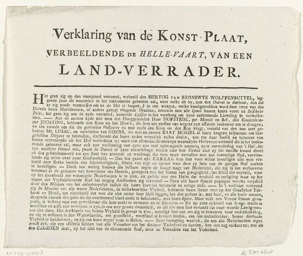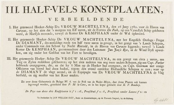Editor: This is "Map met vier platen van historische gebeurtenissen ter zee in de jaren 1781-1784, tweede serie" by Carel Frederik (I) Bendorp, an engraving from 1784. It's quite text-heavy; at first glance, it reminds me of a political broadside, announcing naval events. How do you interpret this work within its historical context? Curator: The emphasis on “Vaderlandsche Historiën,” or national histories, is crucial here. This print wasn't just depicting naval events, it was actively constructing a narrative of Dutch identity and national pride, specifically during a turbulent time. How do you think the artist's choice of depicting naval events, rather than, say, land battles, plays into that construction of identity? Editor: Perhaps it speaks to the Netherlands' maritime history and economic dependence on sea trade? I mean, four out of four events are negative: saving a crew from a sunken ship, capsizing, and the ruin of vessels in storms... what kind of national pride is that? Curator: Exactly! That contrast reveals something deeper. While seemingly celebrating "national histories," the print also subtly hints at vulnerability and loss. Consider the publishers listed: Harmanus Keyzer and Jan Barend Elwe. Their role in disseminating this narrative—these "histories"—is integral. The act of publishing and circulating these images helped create a shared understanding of Dutch experiences, even if those experiences were tinged with hardship. Editor: So, the "national histories" become almost a form of propaganda, shaping public perception through both inclusion and strategic omission? It's interesting that something like this can reflect identity just by showing loss at sea. Curator: Precisely. And by looking closely, we can question whose history is being told, whose voices are amplified, and what purpose that serves in shaping national consciousness. It highlights the complex relationship between art, history, and the construction of identity in the 18th century. Editor: I see now. It's not just about battles and victories but also about how stories are framed and circulated to influence national sentiment. Thank you! Curator: It was my pleasure! Thinking about art with an activist lens opens a pandora box of opportunities for reinterpreting what one already knows.