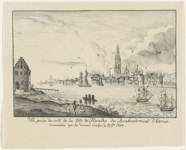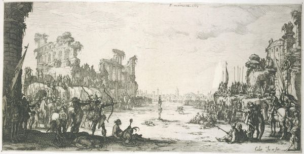 Curator: Here we have "Arrival of Willem V and Wilhelmina of Prussia at the Haarlemmerpoort," an engraving from 1768. It depicts a very grand, ceremonial entry into Amsterdam. What strikes you about it? Editor: First impression? Controlled chaos. All these tiny figures, puff of smoke from a cannon, but it's the level of detail in this miniature cityscape—especially the water reflections—that I can't help admiring. Gives the sense of enormousness. Curator: Right, engravings like this were essentially mass media at the time. The printing process meant this image, and the political message it carried, could be widely disseminated and consumed. Notice how the materiality, this black ink on paper, facilitated the creation of shared public experiences and memories of the Prince's entry. Editor: I see it too—how a very calculated royal "event" is captured as art, making propaganda...beautiful? The whole arrival, the fanfare with watercraft parades, firing cannons – its intended for everyone, like performance art happening in real-time. Curator: The city is more than backdrop, certainly. I mean, look at how prominently the Haarlemmerpoort features, practically an emblem of Amsterdam’s power. It shows the way rulers would utilize architectural infrastructure. Editor: Also, these people appear tiny beside these man-made landmarks. It reminds us of something beyond civic architecture; all the commerce in the docks – the mills, gates, all the structures and the infrastructure. Curator: Exactly! You also see the means of labor, those bridges, the milling power – vital things needed in the creation of civic and economic resources that also define life in Amsterdam. The material realities underscore its narrative significance. Editor: It truly transports you...all these details that point toward all the bustling commotion... This single image creates more questions than I have the bandwidth to imagine answering. Curator: Ultimately it is a fascinating convergence of civic, political and creative interests; that shows the many materials we see, as more than symbolic gestures. Editor: Precisely. I was just looking at the aesthetic grandeur, while you took me on this very human and industrial picture. Thank you.