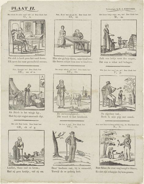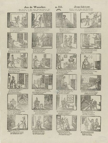 This print, made by Broese & Comp., presents a series of vignettes depicting domestic life. Notice the recurring motif of the couple, Jan and Griet, in their home. These scenes are rich with symbols of domesticity, labor, and marital relations. Consider the image of Jan and Griet together: such pairings echo throughout art history, representing fundamental aspects of human life. Think of similar depictions in medieval tapestries or Renaissance paintings. These images aren't mere records, but rather tapestries woven with cultural threads. Each culture infuses these archetypes with its own nuances. These images evoke deep emotional and psychological responses. They remind us of our own experiences with family, love, and loss, engaging viewers on a subconscious level. Like a dream, it resurfaces, evolves, and takes on new meanings in different historical contexts.