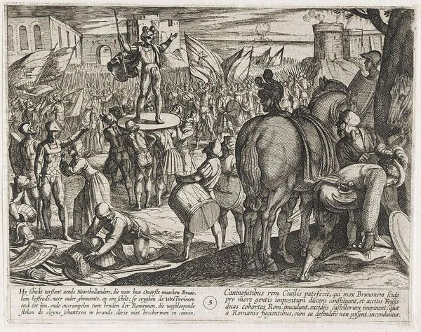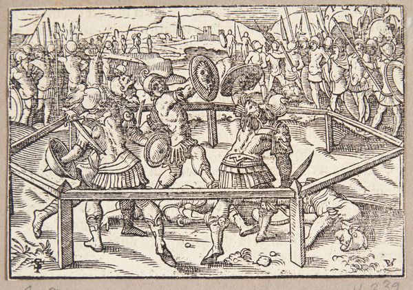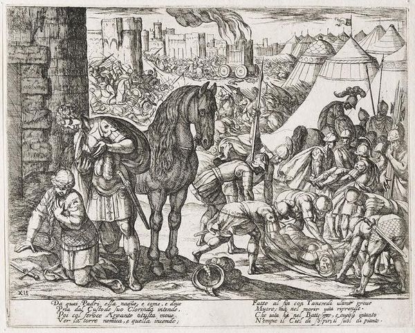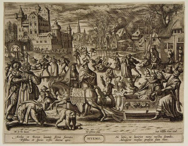 Editor: This print, "February: A Tournament" by Antonio Tempesta, seems incredibly detailed. The energy of the crowd is palpable. What cultural symbols do you see in this lively scene? Curator: Note the prominence of the fish above the scene. Beyond indicating February, it might allude to Lent, a time of penance and reflection. What emotional contrasts do you observe between the revelry below and the symbolism above? Editor: I didn't notice the fish at first! So, the artist is layering celebration with a hint of impending somberness? Curator: Precisely. Consider also how tournaments themselves functioned: displays of power and skill, yet also rituals with deep roots in social hierarchy. Does the print reflect this duality in other ways, perhaps in the arrangement of figures? Editor: I think so! It seems almost staged, despite all the movement. Thanks! Curator: My pleasure. Remember, symbols speak through time.