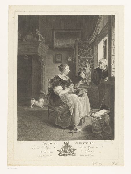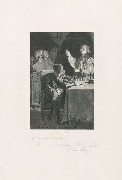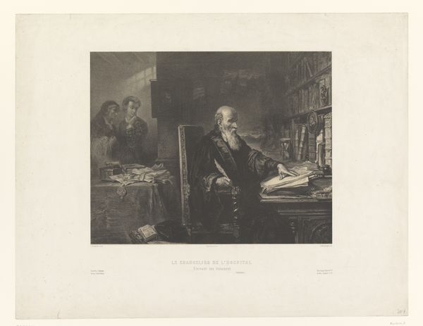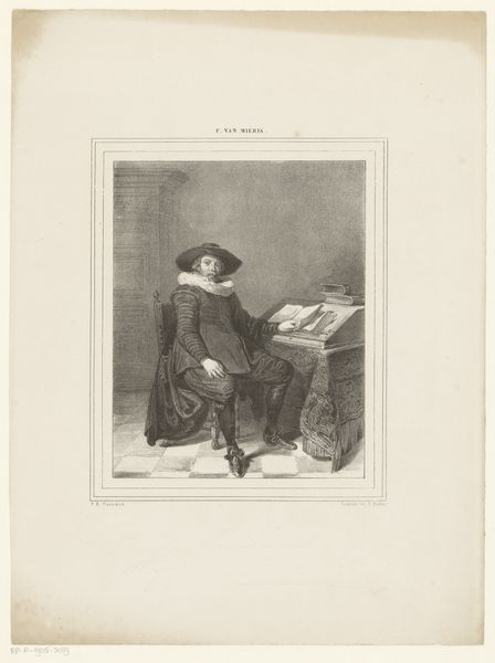 Curator: Let’s turn our attention to this print from between 1840 and 1843. It's titled “Portret van Pieter Christiaensz. Bor” and attributed to Abraham Pieter Felix. Editor: It has a very studious air to it, doesn't it? The figure is hunched over his work, surrounded by books and papers. The tonal range of the engraving gives it a real sense of depth. Curator: Absolutely. Pieter Bor was a significant figure in his time, a historian and a lawyer in 16th-century Holland. Prints like this one served an important public function. Consider that before photography, engraved portraits helped to solidify and disseminate the images of important public figures. It allowed a wider public to form relationships with those in power. Editor: Looking closer at the composition, I'm struck by the strong diagonals: the angle of his desk, his posture, even the scattering of papers lead the eye around. It avoids being static despite the muted palette of blacks, whites, and grays. And you know, the play of light is quite skillful. It falls on his face and hands, drawing attention to his intellect and his engagement with the written word. Curator: Precisely. The realism evident here reflected a burgeoning sense of civic pride, connecting contemporary viewers to a revered past. Images like this were less about capturing an exact likeness and more about creating an icon, a visual representation of civic virtue and intellectual achievement. The books are not just props. They are indicators of piety, of learning, of social position. Editor: And despite the overall somber feel, there’s something quite lively about the textural contrasts—the smooth skin against the rough papers, the dark robes against the crisp collar. Curator: I agree, and that really emphasizes the artist's ability to engage a new, wider audience in art patronage. With this piece, we can really consider the impact and the message communicated by imagery at this time. Editor: It's remarkable to think about how this one small engraving encapsulates so much about form and history, doesn’t it? Curator: Indeed. It gives us plenty to ponder regarding the dynamics of influence, imagery and society.