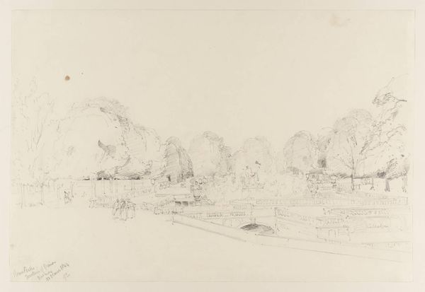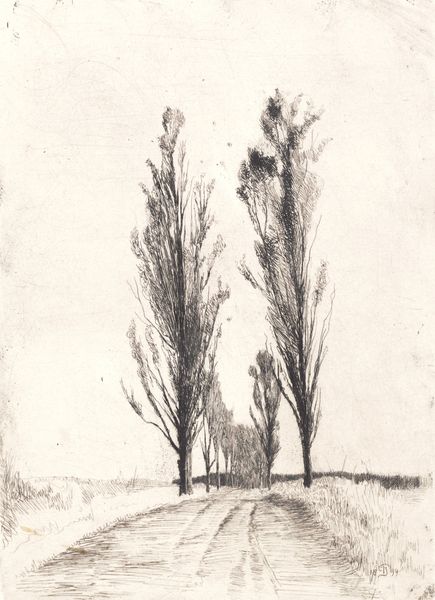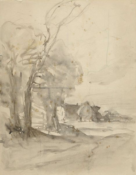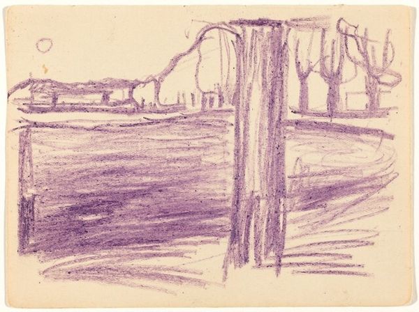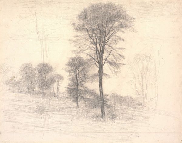 Curator: This is "Puistomaisema, luonnos," or "Park Landscape, sketch," a charcoal and pencil drawing by Magnus Enckell, created in 1891. Editor: The overall feeling is melancholic, maybe even a bit bleak. The sketchiness adds to the sense of transience and perhaps even a lack of definition in the scene. It seems a rather cold environment. Curator: That interpretation resonates with Enckell's wider body of work. We have to understand the context of the time: he was painting during a period of social and political upheaval in Finland. The sketch’s landscape can be read as reflecting the broader uncertainty and precarity many felt. Editor: The prominent trees immediately evoke, for me, a symbol of steadfastness, acting almost like silent witnesses. But those turbulent charcoal strokes used to render their leaves betray this supposed stability and invite a far more chaotic, frenzied reading. This is enhanced by their being almost personified by the artist. Curator: I find that connection between nature and national identity particularly strong at that time. The landscape in art became a key site for exploring themes of national identity and resistance against Russian imperialism. Think about the role nature played in resisting colonial power; how could the landscape offer refuge, resistance, and even sustenance? Enckell’s landscape sketches must be approached with such notions in mind. Editor: Yes, and I'm particularly intrigued by the dark line near the bottom—almost as if something lies hidden beneath the surface. Maybe there are turbulent emotions below what we consider a very plain scenery. I see some cyclical figures, maybe representing a vortex of emotional, historical elements all mixed together. It adds another layer of visual language to this compelling sketch. Curator: Absolutely. It's a seemingly simple landscape, but it reflects profound tensions related to identity, resistance, and the search for stability. Thank you for bringing those subconscious notions to the fore, this adds another exciting interpretive frame. Editor: It reminds us how an art piece becomes an evolving accumulation of culturally shaped images—with the capacity to become personally poignant!