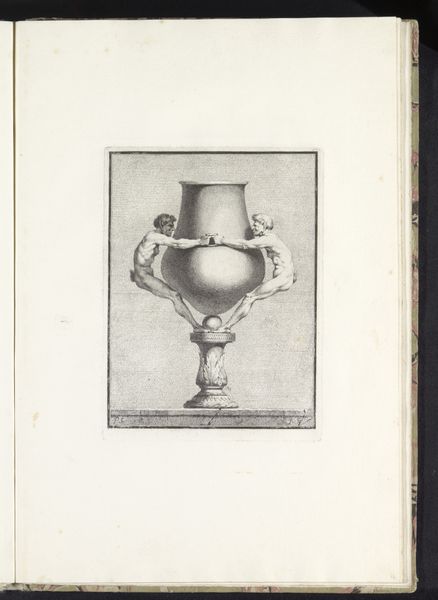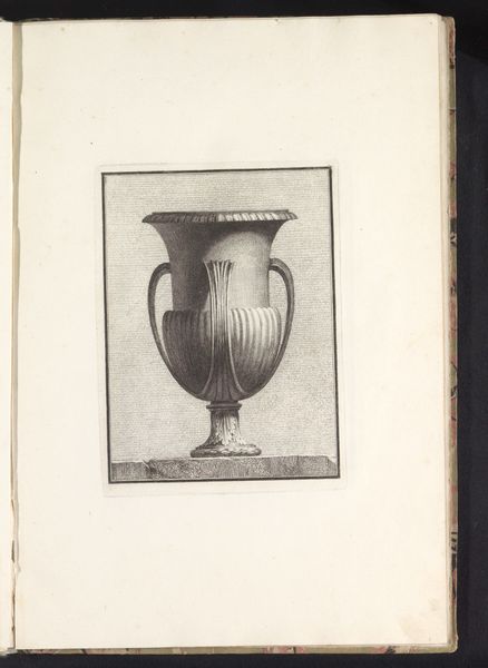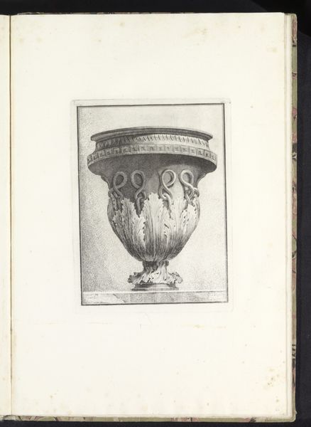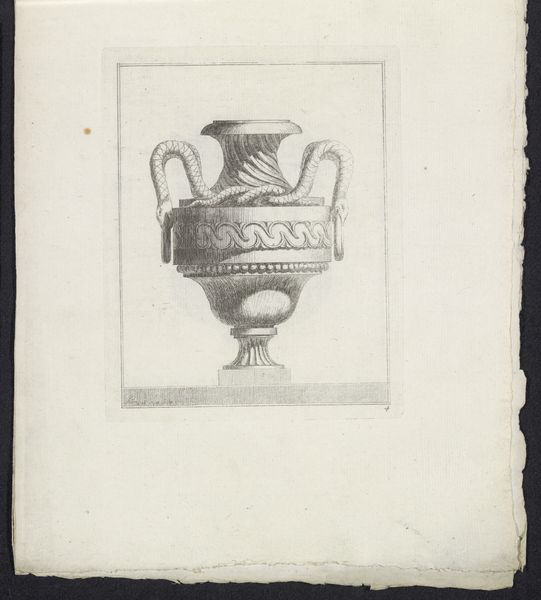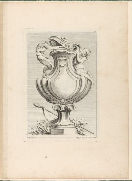Editor: Here we have “Vaas met ramskoppen,” or “Vase with Ram’s Heads,” from around 1755-1768, currently residing at the Rijksmuseum. It looks like an engraving, a fairly simple sketch really. I’m struck by the ram heads; they lend an imposing feel to an otherwise decorative object. How do you interpret this work? Curator: Well, consider the era. The baroque style, even in something seemingly benign like a vase design, speaks to power and control. The ram's heads aren't just decorative; they're potent symbols. In many cultures, the ram signifies virility, aggression, and leadership, but it could also represent sacrifice, given that it was a common offering in ancient rituals. Do you think the vase's design reinforces or subverts social hierarchy? Editor: I suppose reinforces. It feels like a display of wealth and authority rather than anything challenging the status quo. All of those decorative elements… the garlands, the geometric designs… Curator: Precisely. Now, think about who would own such a vase, or more likely, who would commission a drawing of one. These weren't mass-produced items; they were emblems of aristocracy. Engravings like this would have circulated among wealthy patrons or artisans, disseminating stylistic ideas, and perhaps subtly reinforcing the unequal power structures of the time. How might its original context change our understanding of its visual appeal? Editor: I see your point. What I initially perceived as just ornamentation now feels loaded with meaning, reflecting a society obsessed with status and control. Curator: It’s interesting to remember that even in the most ‘decorative’ arts, power dynamics play a significant role. Objects tell stories, but they also embody the complex relationships of the societies that create them. Editor: Definitely gave me something to think about – even a simple vase carries a heavy history. Curator: Exactly! That’s why context is crucial, it reframes our understanding of the past, impacting our future as well.