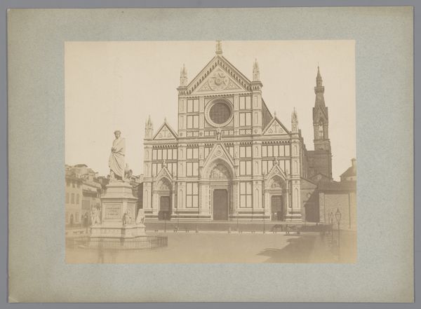 Editor: Here we have a photograph, “Exterior of the Basilica Santa Croce and the statue of Dante Alighieri in Florence, Italy,” likely taken between 1863 and 1900. It's fascinating how this older photo captures the basilica's grandeur and the statue’s imposing presence. I find the starkness quite compelling; the details almost architectural themselves. What stands out to you? Curator: The geometric relationships are striking, aren't they? Consider the way the photographer uses the strong horizontal and vertical lines of the Basilica to frame the softer, rounded form of the Dante statue. The contrast between the geometric exactitude of the building’s facade and the sculptural volume of the statue create an intriguing formal dialogue. Editor: I hadn't noticed how the photographer emphasized the lines of the facade, it is very strong. Does that emphasis contribute to the photograph's overall impact? Curator: Precisely. By focusing on these elements, the photographer calls our attention to the architectural rigor and the precise arrangement of forms within the composition. Notice how the play of light and shadow emphasizes these structured surfaces, further accentuating the contrast with the rounded forms of the statue. The image achieves a powerful visual balance through this careful arrangement of contrasting shapes. It is more about form and light. Don't you agree? Editor: I can definitely see that now, especially how the light helps create that interplay. This really enhances my understanding and appreciation for the artwork. Thanks! Curator: It's been a pleasure. These photographs often hold formal keys that unlock a deeper understanding if one examines the relationships within them.