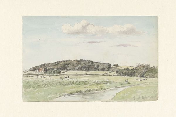 Curator: L\u00e9on Spilliaert created this work, “De Wellingtonrenbaan en het Royal Palace Hotel te Oostende kort na de Tweede Wereldoorlog,” in 1945 using watercolour and colored pencil. Editor: My initial reaction is one of subdued melancholy. There's a tangible sense of loss and ruin; the colors are muted, and the structures in the background look scarred. Curator: The piece invites us to reflect on the consequences of conflict and social reconstruction. The ruins of the Royal Palace Hotel, situated atop a green field, serve as a powerful symbol of cultural memory. I think Spilliaert may be highlighting issues surrounding Belgian identity in the aftermath of the war, particularly when thinking about the occupation. Editor: I agree that Spilliaert subtly engages with questions of Belgian identity. But I also notice the focus on the fields, the earth, how this landscape is rendered by hand. I see a concern for materiality, in the specific application of watercolour and the repetitive use of colored pencil. These tools highlight labor—manual mark-making seems central to understanding this piece. Curator: That is such a critical reading. Viewing it with an eye toward those postwar sentiments, though, brings in considerations about trauma. Maybe the green evokes the natural resilience of land, perhaps indicating how places become witnesses to historical events and human experiences. Editor: That resonates deeply. I'm still considering how the application of watercolour relates to production. Perhaps there is something inherently destructive that can be unearthed in artistic media as well. I am left pondering if Spilliaert wanted the viewer to contemplate both literal ruins and their manifestation through more delicate means. Curator: Reflecting on the ruins portrayed and the history they evoke leads me to reconsider how national narratives intertwine with material destruction and personal memory. Thank you for these fascinating observations on materiality, as these insights truly deepen my perspective of this piece. Editor: And you've shifted my thinking too, making me see a different depth to what appears at first glance a simple landscape painting.