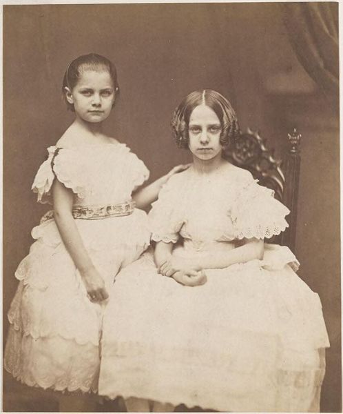 Curator: This photograph, rendered in gelatin silver print, dates back to 1843-1847. It's attributed to Hill and Adamson, and it's titled "Mrs. Grierson". Editor: What strikes me first is the overwhelming feeling of tenderness and shared introspection, the intimate and secure atmosphere created by the gentle touch of one sister over the other. It has a dreamlike, wistful quality to it. Curator: The reality of photography in the 1840s was anything but dreamy, the laborious process with long exposure times required deliberate choices and constructed scenes. This piece belongs to a larger tradition of early photography as well as group portraits, but I agree that these are children that somehow capture a feeling. Editor: Exactly, children tend to possess a purity that reminds the human collective, us as species, of our beginnings, before we lose ourselves and turn into who we are. And in visual symbols the gesture has a huge relevance: that hand placed so protectively evokes maternal guidance, innocence, and above all the sacred bonds of kinship that transcend any period. Curator: You know that the Grierson family was a significant patron of Hill and Adamson, enabling them to do their work. Mrs. Grierson represents a class, an elevated social position that promoted and took part of the beginning of photography and arts in general. It highlights photography's complex dance with patronage and societal elites at that time. Editor: It goes beyond that. We might consider how this image fits into broader romantic ideals. They seem connected by matching clothes and hair in the most subtle display of union. These visual signifiers are the most intimate and meaningful that art can offer. It speaks volumes about family belonging in the most subtle way. Curator: Absolutely, a carefully chosen performance of affection. Seeing this makes me remember how portraiture served to construct and broadcast identities in the Victorian era and the decades after. Photography shaped cultural understanding through staged representations and a very strict point of view. Editor: And how powerful it remains! An embrace across time. I like that feeling of familiar bonding the image conveys, across eras, and cultural values.