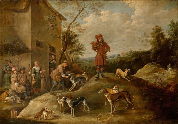 Editor: Here we have Jan Steen’s “Portrait of Jacoba Maria van Wassenaer” from 1660, done with oil paints. It’s a surprisingly busy scene. There are so many animals, and the young girl in the middle seems almost incidental. How do you interpret this work? Curator: Indeed. Though seemingly a portrait, it presents Jacoba within a highly constructed social landscape. Notice how the architecture frames a distant estate – likely symbolic of the family's status and land ownership. What does it say about how the landed gentry understood their relationship to the natural world, or, more specifically, the animal world in this context? Editor: That’s interesting. So, the animals aren't just decorative; they reflect something about her family’s position? Curator: Precisely. Consider how genre painting often encoded societal expectations. Jacoba's presence, amidst this controlled menagerie, subtly reinforces a patriarchal power structure. Is the family subtly presenting itself as stewards, as part of an idealized order that legitimizes their privileged status, not just their class but their place in the world? The inclusion of livestock acts as another symbol of power. Editor: So it's a statement about control, both of nature and, perhaps, of Jacoba herself as part of that controlled environment. I see it now! It feels like a visual statement on the politics of the time. Curator: Absolutely. Jan Steen masterfully weaves together portraiture, genre scenes, and even a landscape background to present a complex statement on class, gender, and power within Dutch society. What would that tell us about the lives of women outside of the elite? Editor: I'll definitely be thinking about that for a while! I didn't initially see all that, it has changed how I see other paintings of the era too.