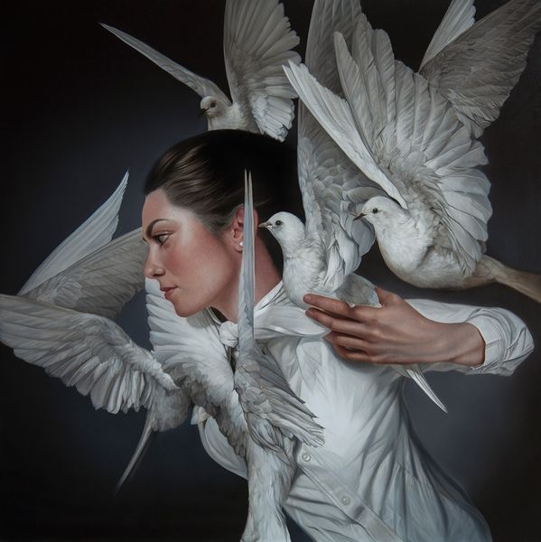 Curator: This painting is titled "RGB" by Eckart Hahn, created in 2014 using oil paint. At first glance, what does it bring to mind for you? Editor: It feels…oddly sterile, yet also undeniably absurd. Like a forgotten experiment in a pristine, slightly mad laboratory. All that gleaming white, and then those dollops of pure pigment just there. Curator: That sterile quality resonates. White peacocks have long held a powerful symbolic charge, often associated with purity, divinity, even blindness to worldly concerns. Hahn seems to invert some of those connotations, though. Editor: Right? The "RGB" title, plus the spilled paint. It smacks of deconstruction, like he's broken down this symbol of untouchable beauty into its component parts: light itself, and then primary colours that could, theoretically, recreate *anything.* Curator: There's also the position; we rarely see a peacock presented from the rear! The typical frontal display of iridescent feathers is conspicuously absent. Here, it is the mundane tail feathers and unassuming backside that grab our attention, an unusual way to depict pride. Editor: It's almost an anti-peacock, yeah? The usual symbolism inverted, but without becoming cynical. The vulnerability makes it more powerful. It’s standing in the mess of creation, so it becomes almost like a portrait of an artist in the studio or something. Curator: Precisely. Considering the meticulous realism, it's tempting to read those pools of pigment as emotional, not purely technical. The peacock, blinded by its whiteness, or perhaps feigning blindness, steps into the creative chaos it might prefer to ignore. Editor: Maybe the "blindness" is intentional, and part of the art piece - the art world. We all do crazy things like that and pretend that's how it is. It looks incredible, really, because the symbolism really has depth. What you find if you let it pull you in is impressive! Curator: It's a work that holds those dualities in tight suspension: reverence and irreverence, elegance and the earthy reality of artistic practice. Editor: Agreed. It makes you rethink the whole notion of image and what is "behind it," literally. The title only reinforces that deconstruction - brilliant.