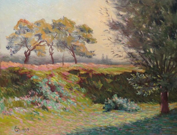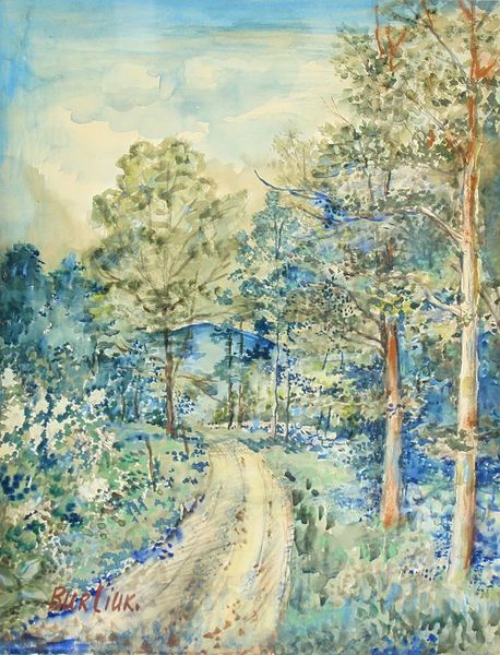 Editor: We're looking at Jaroslav Keluc's "Home in the Woods," created in 1975 using pastels. The colors are so vibrant, almost feverish, especially that bright red roof peeking through the trees. It feels both inviting and slightly… overwhelming. What stands out to you? Curator: Overwhelming, yes! Like nature reclaiming something built by human hands, but not in a menacing way. It's a nostalgic embrace, perhaps? The forest feels alive, teeming. See how Keluc renders the trees— not with photographic realism, but with this frantic energy, almost as if the trees themselves are breathing, swaying in an unseen wind, sharing secrets. What does “home” mean when it’s swallowed up by nature? Editor: That makes me think about the individual versus the collective – the little home being part of something so much bigger and older. Does the house become insignificant? Curator: Or does it gain significance through that relationship? Like a single thought within a universe of them! Keluc invites us to question the boundary between interior and exterior, safety and wildness. What kind of dreams do you think happen inside a home like that? Editor: Maybe dreams steeped in the forest. Something less...sterile. This has given me so much to consider regarding how place and identity interplay. Curator: And me! I am pondering my next forest-filled daydream, thanks to Keluc and your intriguing interpretation. It is like a shared landscape within our minds.