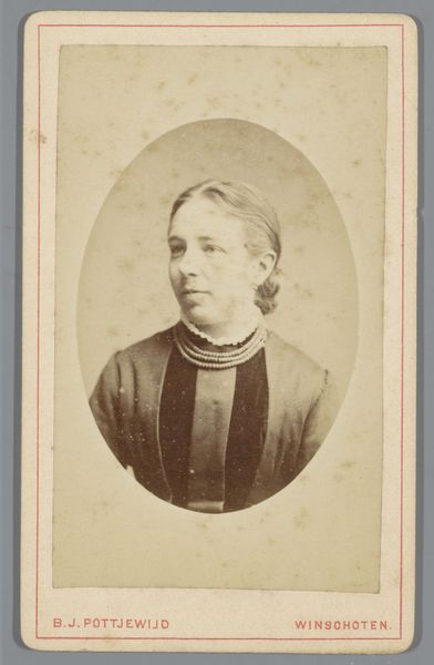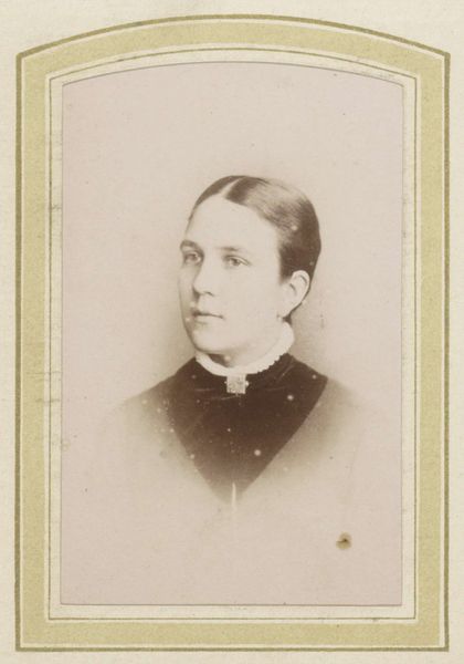 Editor: This gelatin-silver print, “Portret van een vrouw,” by Carel Gustaaf Hisgen, probably created somewhere between 1884 and 1897, is fascinating. The oval frame and sepia tones lend it a distinctly melancholic air. What do you see in this piece? Curator: Oh, the sweet melancholia of days gone by! To me, this portrait speaks of more than just an era, but of untold stories, secrets locked within the gaze of a woman we know nothing about. It is history caught in a shimmering dance of light. Consider, if you will, how Hisgen utilizes photography not merely as documentation but as an emotional canvas. Notice her gentle posture...does it communicate the vulnerability of existing? Does this invite questions about self, existence and maybe also memory and preservation? Editor: It does seem quite staged, perhaps indicative of the period’s photographic conventions. What strikes me is the contrast between the subject's plain attire and the elaborate gilded frame, but I'm wondering what's your sense of its broader context? Curator: You've stumbled onto something pivotal there. That tension – the quiet austerity against a decorative flourish. That frame screams bourgeois respectability while she...well, her gaze avoids us. It seems almost she's an actress stuck in a part, longing for another play. As the technology shifted, do you see her struggling within the expectation of realism in a world obsessed with accuracy and 'Truth?' And if so, can we, through her photograph, liberate her from this antiquated construct? Editor: It's so interesting how much you can unpack from a simple portrait. I appreciate how you highlighted that tension. I guess photography of the time becomes almost performance in itself. Curator: Precisely! These 'silent' actors from history urge us to question their narratives; not just observe the image. The layers, like photographic chemicals, await activation by an engaging spectator such as yourself. And that, my friend, is the delightful chaos of the art.