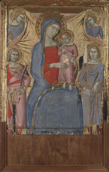 Editor: So, here we have an intriguing tempera painting from the late medieval period, around 1325 to 1335, titled "Coronation and Death of the Virgin." It's striking how the artist depicts two distinct scenes stacked vertically. What do you see in this piece? Curator: What strikes me is how this work, ostensibly about religious figures, subtly reflects the power dynamics of its time. We see the Virgin Mary’s life presented as a narrative controlled by male figures—God the Father crowning her in heaven while earthly male figures preside over her death below. It really prompts the question: whose story are we *really* seeing? Editor: That's a fascinating perspective. I hadn't considered it in terms of power dynamics. Are you suggesting that even in religious art, we find echoes of patriarchal structures? Curator: Precisely. The figures surrounding the Virgin’s deathbed, mostly male apostles, emphasize her role as a figure to be venerated and managed, even in death. Consider the implications of Christ, the baby, held in someone's arm like an object. Doesn't this visual reinforce the theological argument and political strategy concerning who gets to occupy the driver's seat in earthly structures and spiritual narratives? Editor: I see what you mean. It's almost as if the painting reinforces a specific social order under the guise of religious narrative. Are the bright colors and the use of gold also communicating a particular message here? Curator: Absolutely. The gold, often associated with divinity and purity, elevates the Virgin, yet also serves to solidify the Church's wealth and authority. These choices always serve power, so they are never innocuous or purely artistic. The question we need to keep asking is always: for what purpose was this painting created and for whose benefit? Editor: Wow, I’m starting to see this piece in a completely different light. I initially focused on the religious aspects, but your interpretation highlights a powerful commentary on gender and societal structures. Curator: And that’s the beauty of art history; it’s never just about the aesthetics. It's about unpacking the layers of meaning embedded within the work, especially how they reflect and reinforce the social and political landscapes of their time. Editor: Thank you. It’s so interesting to consider how a seemingly devotional image can be such a rich source for discussing issues of power and representation.