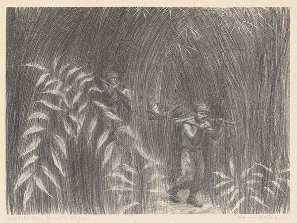 John A. Noble made this drawing, Pipes in the Forest, using what looks like pencil or maybe lithographic crayon, and the marks are all about work, labor, industry. It's a gritty scene and the drawing style really matches the subject. The texture Noble achieves with simple hatching and cross-hatching is fascinating. Look closely at how he renders the figures: there is a real sense of weight, particularly in the man using the wrench. The variations in tone – from dark shadows to bright highlights – give the scene depth, but it's the detail that grabs me. The way the artist captures the rough textures of the pipes and the surrounding forest is so tactile, you can almost feel the grit and grime. The marks around the edges of the pipe seem to continue past the edge of the object, making you wonder what the process looked like. Noble's work reminds me a bit of other American Scene painters like Thomas Hart Benton, who were also interested in depicting everyday life and labor. But Noble brings a certain intimacy to his work. It's like he's inviting us to witness a moment in time, to appreciate the hard work and skill of the men building this pipeline. It's not about grand narratives, but the quiet dignity of human effort.