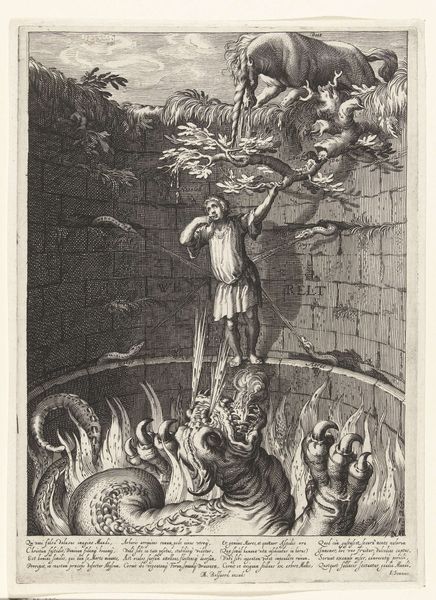Editor: This engraving, "Hercules Killing the Lernean Hydra" from around 1528, depicts that famous scene. The density of line work creates a pretty dramatic image, but all those hydra heads jumbled together are a bit confusing to untangle at first glance. How do you interpret this work? Curator: The confusion is key, isn't it? The Hydra, multiple heads sprouting anew when severed, is an ancient symbol, deeply rooted in anxieties about unchecked proliferation. Think about the context: 1528. What's proliferating then? Perhaps religious schisms, the spread of new ideas enabled by the printing press itself. Editor: So, the Hydra isn't just a monster. It's a symbol of something larger going on at the time? Curator: Precisely. Hercules, hacking away, embodies the struggle to contain these anxieties. Consider his Herculean effort. Isn’t the act of endless battling a symbolic one, indicative of larger societal anxieties being grappled with through allegory? Also, look at the wild-haired figure and his muscular physique—he harkens back to the classical ideal. It becomes a story about imposing order on chaos, of classical values taming the monstrous unknown. Editor: It's fascinating how much cultural meaning is packed into one image. Curator: Visual symbols evolve, taking on new layers of meaning with each telling. The engraver isn’t just illustrating a myth; they are engaging in cultural memory, tapping into our collective understanding of good versus evil and of order against chaos. Editor: It completely shifts how I see the piece, I’m going to have to explore this symbology further. Curator: Exactly, by viewing and thinking we can explore. What have you learnt from the symbolic, metaphorical density when viewing this work?