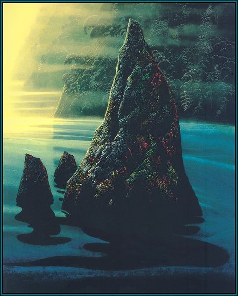 Eyvind Earle created Seaside Splendor using a silkscreen. The artwork’s composition, immediately presents a dichotomy between naturalism and stylization, its forms are meticulously organized. The chromatic intensity, oscillating between cool blues and vibrant greens, generates a dreamlike emotional state. Earle’s employment of line— particularly evident in the stylized treescapes—functions as a semiotic marker. The trees, rendered with almost geometric precision, do not merely represent natural objects; they signify an ordered, structured interpretation of nature itself. The artwork exists in a dialogue with the broader artistic trends of the mid-20th century, reflecting a transition from the pure abstraction. Earle superimposes a structured artistic vision onto the natural world, challenging the viewer to reconsider the boundaries. The artwork is a testament to the enduring power of visual structure and the potential for an image to communicate meaning through its formal elements.