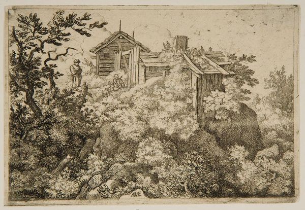 Editor: Here we have Martin von Molitor's "Thatched Cottage," an etching. It's incredibly detailed. What strikes me is the sheer amount of labor involved in creating such a precise image, especially given the subject. What do you make of it? Curator: I see a fascinating intersection of class and craft. Consider the labor to build the cottage itself, likely the product of agricultural workers. Molitor then recreates it through a laborious printmaking process. Do you think he's elevating the cottage or aestheticizing rural labor? Editor: Perhaps both? The final product, as a print, could be disseminated and consumed by a different class. Curator: Exactly. The means of production and the artwork's accessibility highlight the complex social dynamics at play. Editor: It's amazing how a simple landscape can reveal so much about society through its materials and processes. Curator: Indeed! It makes me rethink how we value both art and labor.