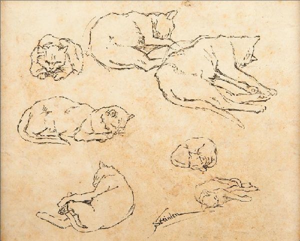 Théophile Alexandre Steinlen created this study of cats with pencil, capturing the essence of feline repose. Throughout history, the cat has been a symbol of duality: embodying both domesticity and wildness, comfort and independence. In ancient Egypt, the cat was revered, a protector against evil, often associated with the goddess Bastet. Here, the scattered poses—some alert, others deeply asleep—reflect the cat's mysterious nature, a creature dwelling on the threshold of awareness. Consider the recurring motif of the sleeping figure across cultures. From the slumbering Ariadne, abandoned by Theseus, to the countless depictions of sleeping children, sleep represents vulnerability, a temporary surrender to the subconscious. The cat, in its slumber, mirrors this state, inviting us to consider the hidden depths beneath a placid surface. Steinlen captures not just the physical form of the cat, but also its psychological space, its inner world of dreams and instincts, a reminder of the ancient, untamed forces that persist within the domestic sphere.
