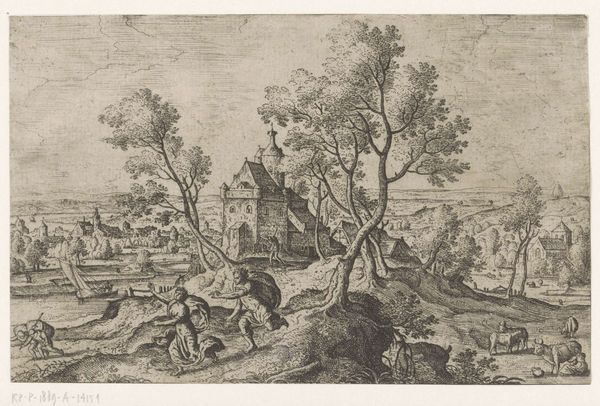 Editor: We're looking at "Landscape with a Castle, with Three Women in the Foreground" by Adriaen van der Kabel, created sometime between 1630 and 1705. It’s an ink and etching print. I’m immediately struck by the contrast – the peaceful foreground with the women, against this castle billowing with smoke in the background. What historical context should we keep in mind to best grasp the symbolism? Curator: Indeed, that contrast is key. What first seems a simple landscape unveils itself through its symbols. Consider the castle. What does a fortified structure represent to you? Editor: Power? Authority? But with the smoke, maybe something under threat? Curator: Precisely. Think about the Baroque period – rife with conflicts, both religious and political. The castle, scarred and smoking, could symbolize a societal order under duress, perhaps even a warning about the fragility of power. How, then, do the women in the foreground resonate against this backdrop? Editor: They seem almost oblivious. Like a pastoral scene, separate from the castle’s troubles. Maybe a commentary on the everyday life continuing amidst upheaval? Or, if we’re thinking about symbols, perhaps they embody resilience? Curator: I like that – resilience. Their seeming detachment highlights a crucial human capacity: to find normalcy, even beauty, amidst chaos. Van der Kabel layers these symbols to provoke thought. It's a visual poem about survival and continuity. Do you think the artist conveys any emotion through the line work itself? Editor: It’s intricate but not overly precious. There’s a certain roughness, particularly in the depiction of the trees and the castle walls. That could add to the sense of unease. Curator: Yes, the dynamism inherent in the etching suggests the flux of history and the precariousness of human endeavors. Editor: It’s fascinating how much information and feeling is packed into a seemingly simple landscape! Curator: Agreed, viewing the landscape through this iconographic lens shows the emotional weight of visual symbols throughout history.
