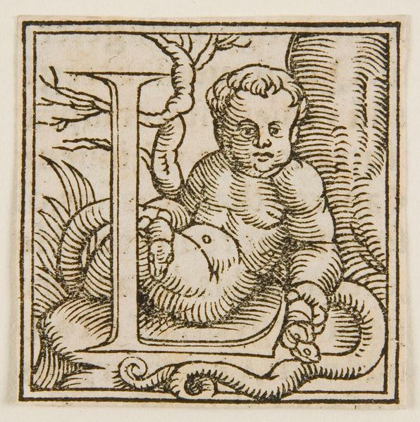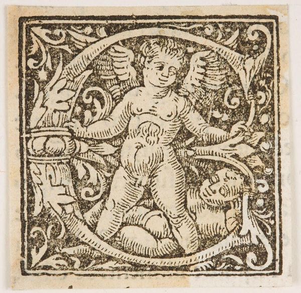 Editor: Here we have a charming woodcut initial, the letter C, used by Johann Gymnicus. It's so tiny! There's a little cherubic figure nestled inside the letter. What do you make of this diminutive scene? Curator: Well, it’s like stumbling upon a secret garden, isn't it? This 'C' isn't just a letter; it's a whole world. I see childhood innocence intertwined with nature, a miniature Eden perhaps? The anonymous artist packed so much life into such a small space. Editor: A miniature Eden, I like that! It does feel very self-contained. Curator: Exactly! It invites us to imagine the stories that begin with this letter. What worlds will it open? It’s a portal in disguise! Editor: I never thought of it that way, it's like the start of something magical. Curator: Precisely, each initial is a tiny adventure waiting to unfold.