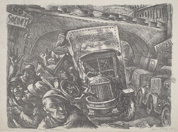 Editor: Let's take a peek at "After Biagio di Antonio" by Sir Eduardo Paolozzi, residing at the Tate. It's like looking through a vintage car windshield at... a construction site turned historical battle? What do you make of this layered scene? Curator: Ah, Paolozzi! He always manages to conjure a beautiful mess. It feels like a memory, filtered through the grit of the everyday. The car interior grounds us, while the scene beyond the glass… it's a jumble of figures, perhaps Renaissance soldiers, or stage actors? It asks us, what is reality, and what is performance? Editor: So it's less about historical accuracy, and more about... the theater of history? Curator: Precisely! And the act of *seeing* history. We're in this car, voyeurs, observers of a world both familiar and utterly strange. It's a reminder that all history is a construct, a story we tell ourselves. Editor: I never thought of it that way. I'm off to ponder the stories I tell myself. Thanks! Curator: My pleasure. Now, off you go, and become history!
