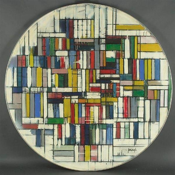 Fritz Glarner's "Colored Drawing" presents a compelling exploration of form, line, and color, encased within a circle. The composition consists of rectangular forms in primary colors—red, blue, and yellow—alongside shades of grey, and blacks. These elements intersect and overlay to produce a dynamic visual rhythm, yet there is a tension between geometric abstraction and the organic qualities of hand-drawn lines. The sketched lines give it an immediacy and personal touch, contrasting with the clean precision often associated with abstract art. Glarner was deeply influenced by the De Stijl movement, which sought a universal visual language through pure abstraction. Here, he pushes against the movement's rigid constraints. By integrating hand-drawn lines, Glarner humanizes geometric forms and complicates any straightforward reading, encouraging us to look closely and question what we see.