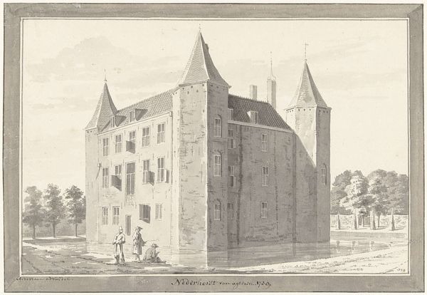 Curator: Well, that's awfully imposing, isn't it? So straightforward, almost blunt in its declaration of... what, permanence? The greyscale softens it somewhat, I suppose. Editor: Indeed. This pen and paper drawing, "Het Valkhof te Nijmegen" by Pieter Jan van Liender, made in 1752, showcases a rather important historic site. The Valkhof was once an imperial palace, steeped in layers of Roman and medieval power. It served as a military and administrative center for centuries, until most of the structure depicted was demolished in 1796. Curator: Demolished! That explains a lot. The starkness, that lingering... grief, perhaps, around the edges. I find the tiny figures so interesting. It makes me feel that I'm looking into the past in a unique way, almost voyeuristic. What about you? Editor: These figures can be viewed as class markers and social stratification of the eighteenth century. This rendering captures a frozen moment in time, right before societal disruption, and makes a silent political statement on behalf of the hierarchy during the Age of Enlightenment. But the birds in the sky imply some notion of freedom despite these restrictions. It seems they know something is coming that the depicted populace cannot grasp. Curator: The drawing's composition makes it seem as though the buildings themselves are almost sentient. Stoic watchers before their inevitable disappearance. A fascinating glimpse of mortality captured with a steady hand. Editor: I would also argue that its detailed nature acts as a form of preservation. An activist recording of historical evidence on the verge of destruction, for purposes of resistance. And that awareness infuses the seemingly objective portrayal with unexpected agency. Curator: Agency from fine strokes of a pen. Imagine that. And maybe even agency for us, as viewers, to reflect on time's passage and architecture as living narratives, not static monuments. Thanks for a new layer of depth on what seemed to me to be just an ordinary and sad depiction of some buildings, honestly. Editor: Thanks to van Liender's illustration we’ve managed to unpack social hierarchies while examining an artist's subtle call to social responsibility, both relevant today.