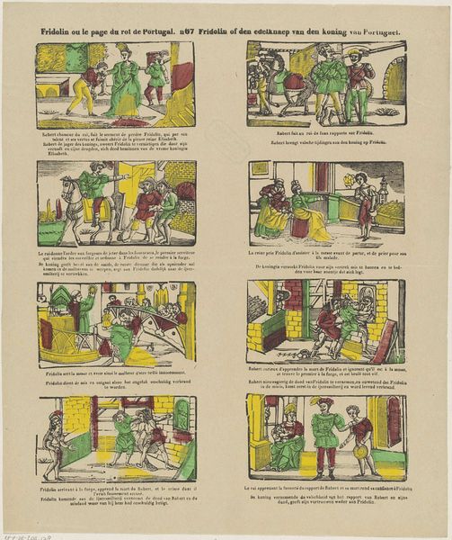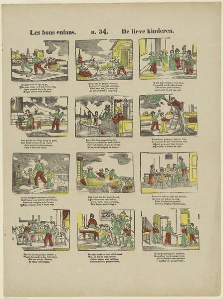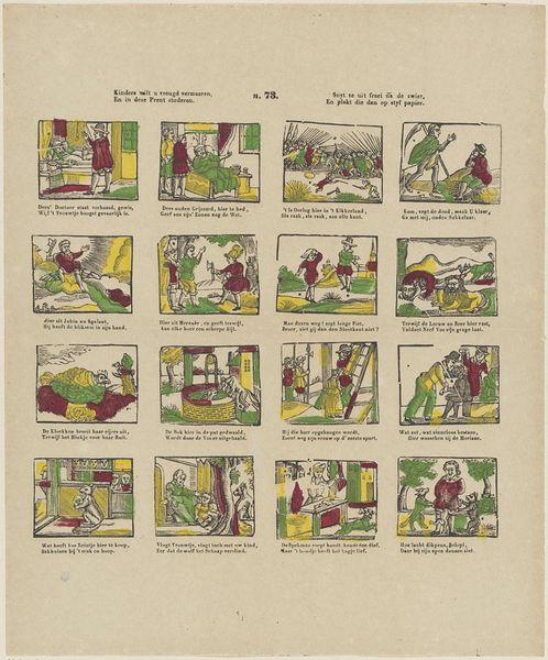 Curator: Here we have a fascinating print entitled "Geschiedenis van Reinaert de vos / Histoire de maître Renard," dating from between 1856 and 1900, and attributed to Glenisson & Zonen. Editor: My goodness, it’s like stumbling upon an ancient meme! The composition with all those panels gives me such a narrative sensation. Is it a full story told, you think? Curator: Absolutely, it seems to present a complete, sequential tale of Reynard the Fox—a figure from European folklore— told in 24 panels. Notice the details. It seems as though it has some color and each picture comes with some writing in both French and Dutch. This print employs engraving as a printing method and functions as a sort of comic strip, quite innovative for the period. Editor: The engraving technique! Intricate and mass-produced, right? And the material – cheap paper? I imagine this was circulated widely, bringing tales of cunning Reynard to the masses, across social classes. It's amazing how material constraints can really liberate access to artistic forms. Curator: Indeed, it bridges what you might consider ‘high’ and ‘low’ art. Think about the labor involved in the process, too. Consider not just the artistic skill, but the production chain bringing images and stories like this to homes and marketplaces. This feels very aligned with the core of folk art’s mission, don’t you think? It's art made for everyone. Editor: Yes, these images are infused with symbolism! Reynard, the sly trickster, embodies resistance against societal norms, I wonder about the power structures depicted. I think about how someone like Glenisson tapped into popular folklore not just for entertainment, but for perhaps, subtle social commentary too. This resonates still, doesn’t it? It speaks volumes, then and now. Curator: Precisely. From the artist’s perspective, there is something profoundly captivating about seeing the characters playing out their story within those lines, the very constraints seeming to unleash greater storytelling and expression. Editor: Indeed, each of us extracts unique layers of meaning! It's the magic of storytelling through material, form, and character, transcending its era.