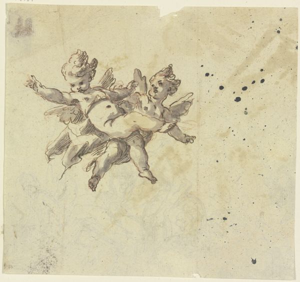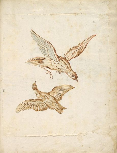 Editor: So, this drawing, "Two Flying Birds" by Pandolfo Reschi, made sometime between 1640 and 1696, uses ink to capture these birds in mid-flight. What strikes me is the immediacy, how dynamic it feels despite the simplicity of the materials. What do you see in this piece? Curator: I see a fleeting moment captured, yes, but also an echo of older, symbolic traditions. Birds in art often represent the soul, freedom, or divine messengers. The very act of depicting flight hints at transcendence. Look at the Renaissance, for example, and the constant symbolism of doves and eagles in paintings! Do you see how this work, though simple, partakes in a centuries-old visual vocabulary? Editor: That's interesting! I hadn't considered the longer history of bird imagery. So, even without overt religious symbols, the idea of flight still carries that weight? Curator: Precisely! Reschi might not have intended a direct religious allegory, but the cultural memory of birds as spiritual symbols lingers. And consider their direction. One ascends, perhaps toward heaven, the other dives towards earth. What duality does this convey? Is it a psychological split, or the meeting of the spiritual with the corporeal? Editor: That contrast between ascending and descending hadn't clicked for me. So, it is a dialogue? I suppose it’s easy to focus solely on technique or the literal image. Curator: It is, and these subtle elements whisper volumes about how humans understand and convey ideas, creating connections between what we see today and ages past. I learn constantly, and images show us who we are. Editor: Absolutely! This deeper connection is quite thought-provoking.