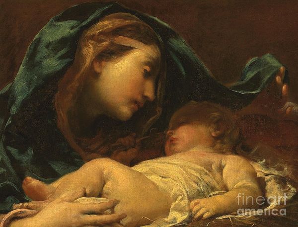 Firmin Baes created "Sweet Dreams," a tender image rendered with soft, muted tones. Notice how the composition centres on the intimate embrace between mother and child, forming a pyramidal structure that stabilizes the scene. The gentle curve of the mother's head mirrors the infant's form, creating a visual echo that amplifies the emotional connection. Baes uses light to sculpt the forms, with subtle gradations defining the contours of their faces and bodies. The colour palette is restrained, predominantly consisting of earthy pinks, blues, and creams, which enhances the quiet, serene mood. This work engages with the concept of idealized motherhood. Yet, it also challenges fixed notions of sentimentality through its formal structure. Baes employs classical compositional techniques to elevate a common, everyday moment into something timeless and universal. Look at the slight blurring of details, a technique that softens the image. This formal quality allows the artwork to function not just as a depiction, but as an exploration of form, light, and the complex interplay of emotion and representation.
