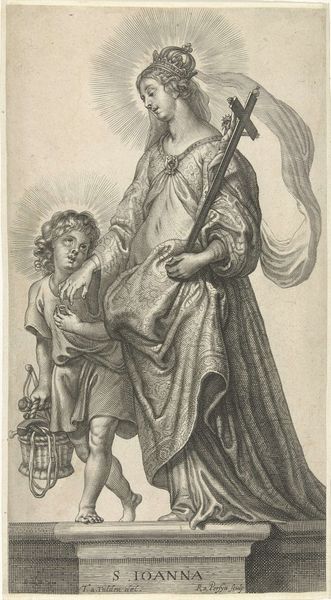 Curator: Welcome. We’re standing before "H. Dorothea", an engraving by Theodor van Merlen, dating from somewhere between 1619 and 1672. This baroque print depicts Saint Dorothea, the virgin martyr, attended by a cherubic figure. Editor: It strikes me as incredibly graceful, despite the formal subject. The way the light catches the fabric, and that sweet little angel lugging around what looks like a basket full of fruit—there’s a playful contrast there. Curator: Precisely. Van Merlen situates Dorothea within a visual and ideological framework reflecting both baroque aesthetics and Counter-Reformation values. Her status as a virgin and martyr—clearly stated beneath her feet—speaks directly to anxieties about female sanctity and religious authority during the period. Editor: I see what you mean about that "virgin and martyr" pronouncement—a pretty hefty introduction! And that halo—not exactly subtle, is it? Still, she's holding that rose so delicately, it brings this vulnerability, it sort of offsets all the "official" stuff. Curator: Yes. Her presence alongside an angel offering fruit highlights the complex allegorical layers inherent in depictions of saints during this time. This imagery also works within a tradition of symbolic association, where both fruit and roses can represent paradise. Editor: You know, I can almost smell the earth and those blooms when I look at this, even though it's a print. Maybe that sounds crazy... Curator: Not at all. These engravings were made to circulate. So consider how Dorothea resonated then and think about what continuities there might be in how women’s bodies are still visualized as symbols today. Editor: Looking closely now, it feels like she is inviting us into a space of quiet contemplation on life and faith. Thanks for making me see so much more than just a nice picture. Curator: The power of this print is its ability to invite ongoing dialogues. It layers so many elements of faith, martyrdom, hope, gender, and sacrifice. It continues to challenge us to engage with its history, to discover new resonances, and maybe find echoes of its stories in our present.