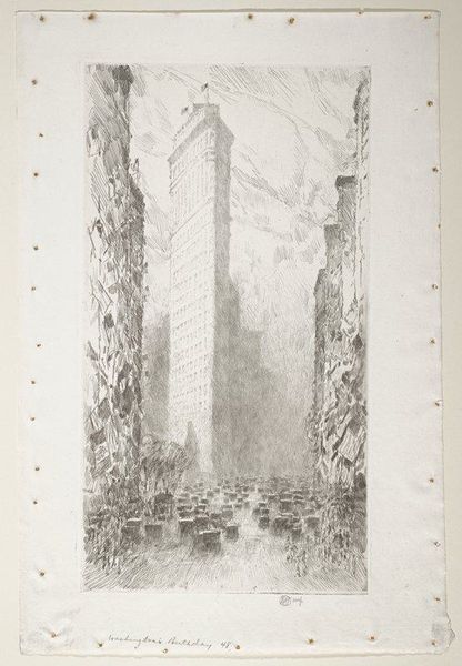Childe Hassam created this etching, “Washington’s Birthday—Fifth Avenue & 23rd Street,” capturing a moment in New York City. It's a scene of patriotic display and urban life. The American flag decorates Fifth Avenue, a symbol of national pride intertwined with commerce and daily routines. Made in the early 20th century, this image reflects the urban transformation of America. It was a time of rapid growth and the development of iconic cityscapes. The Flatiron Building, then a modern marvel, dominates the skyline. Hassam presents a bustling, almost chaotic street scene, yet it is ordered by the architectural structure. The work is a celebration of American identity, linking national symbols to the commercial heart of a city. Understanding this artwork requires a look at the cultural symbols of the time. Historic records, newspapers, and other documents can help us better understand the relationship between patriotism, urbanism, and national identity. The study of art helps us understand social change and the shifting values of a nation.