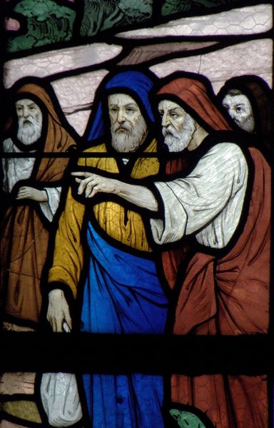 Editor: This is a detail from Ludovic Alleaume’s "Life of Christ" made of glass in 1919, part of the Eglise Saint-Sulpice de Fougères. The figures have this almost somber, ethereal quality. I’m drawn to their faces, so expressive and pained. How do you read the emotional landscape here? Curator: Ah, stained glass, stories in light, and Alleaume paints a beautiful lament. For me, these aren’t just figures frozen in colored glass. Look closely – the woman on the left, almost a dove-like blue, her hand clasped to her chest - this intimate gesture radiates inward. There’s a powerful sense of sorrow in this composition. Have you ever considered how personal tragedy after World War I may have inspired the mournful expressions in the people, giving them their human likeness, imbuing with loss, suffering and sacrifice? Editor: I hadn't thought about that context specifically. So it's not only biblical grief we’re seeing, but perhaps also grief from recent historical events. That’s heartbreaking. I appreciate the perspective you bring here. Is the historical tragedy you cite one of the reasons why you interpret the artist using these people in familiar roles of mourning and remembrance of past traditions? Curator: Absolutely, and consider too how glass itself transforms under light, how transient these images can feel – moments flickering. And the narrative traditions they build are the cultural bricks where we draw on past knowledge of human behaviors and patterns, which only seem to continue. Editor: The effect of light certainly brings in some ephemeral life to these portraits. Now I’m contemplating grief, loss, light, and history – it all feels more complex than I initially thought. Curator: Exactly! That’s art's trick—turning flat colors into a multi-layered story! Now you have to look and feel, all at once.