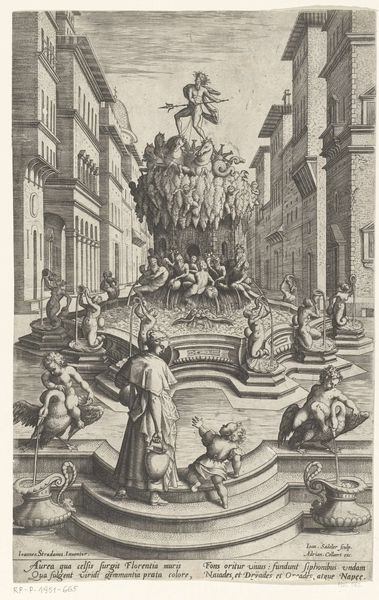 This print, "Vaas gedragen door twee naakte mannen," was created by an anonymous artist. It offers a fascinating glimpse into the circulation of designs and the social function of luxury objects. Made in Europe, likely during the Baroque era, the image showcases a lavish vase supported by two nude male figures. The vase itself is adorned with classical motifs, reflecting a broader cultural fascination with antiquity. The print may have served as a design template for artisans, allowing them to replicate or adapt the vase for wealthy patrons. The presence of onlookers in the print also suggests the display and appreciation of such objects within elite social circles. This vase and the print represent not just artistry, but also status and power. Understanding this print requires looking into the history of decorative arts, the patronage system, and the role of prints in disseminating design ideas. These avenues of inquiry shed light on the social and economic contexts that shaped artistic production and consumption.