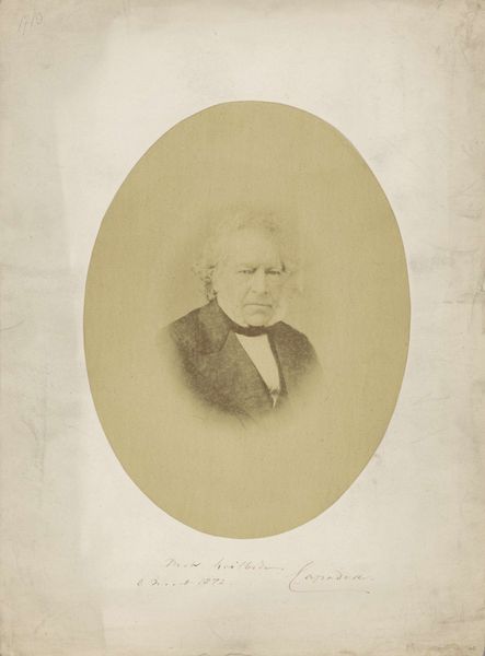 Editor: So here we have an albumen print from 1879, a portrait of Adolphe Crémieux, a French politician and minister, by A. Griveau. It has a somber, serious feel, very typical of photography from this period. What draws your eye when you look at this, how do you interpret this portrait? Curator: The oval frame itself becomes a symbolic portal. Crémieux is presented almost like a classical bust, a form harking back to Roman ideals of civic virtue. Note how his gaze avoids ours, suggesting introspection and wisdom gained over decades of political life. Do you think that the very photographic medium – albumen print – plays a part in its cultural significance? Editor: Definitely. Albumen prints, known for their sharp detail and tonal range, lent a certain gravitas to the subject. I’m curious about the choice of oval, though, as opposed to a rectangle or square frame. Curator: Precisely! The oval softens the formality. It lends the image an air of intimacy, as if we’re peering into Crémieux’s personal space. Oval frames were incredibly popular for portraying family members at the time. In terms of iconography, an oval traditionally implies birth or beginnings. However, it could also reflect a cycle of life—considering the Crémieux’s age. Editor: I hadn't considered those symbolic readings of the frame itself! It adds another layer to my understanding of the piece. Curator: Right? Every detail counts when deciphering visual language! The clothing choice speaks volumes about his profession. Photography immortalizes figures, allowing people to analyze these small, telling details. It becomes more than a portrait; it becomes a cultural artifact, telling a story about a time, a person, and the values they represented. Editor: This was enlightening. It really opened my eyes to the symbolic language of even seemingly simple portrait photography. Curator: It's all about seeing the echoes of cultural memory embedded in the image. Always remember, look closely, question everything!